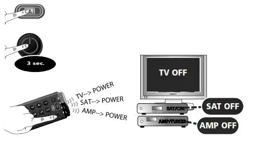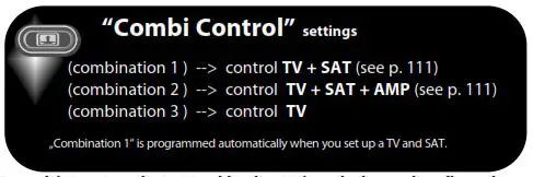 In Combi Control the POWER key will switch ON/OFF all devices within the activated Combi Control Setting – simply by pressing it for 3 seconds. E.g. within Combi Control combination 2 you can switch OFF your TV, SAT and AMP by by pointing towards these devices and simply press and hold the POWER key for 3 seconds.