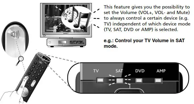 Mute keys will always control “TV volume” independent which device mode key (TV, SAT, DVD or AMP) is selected.