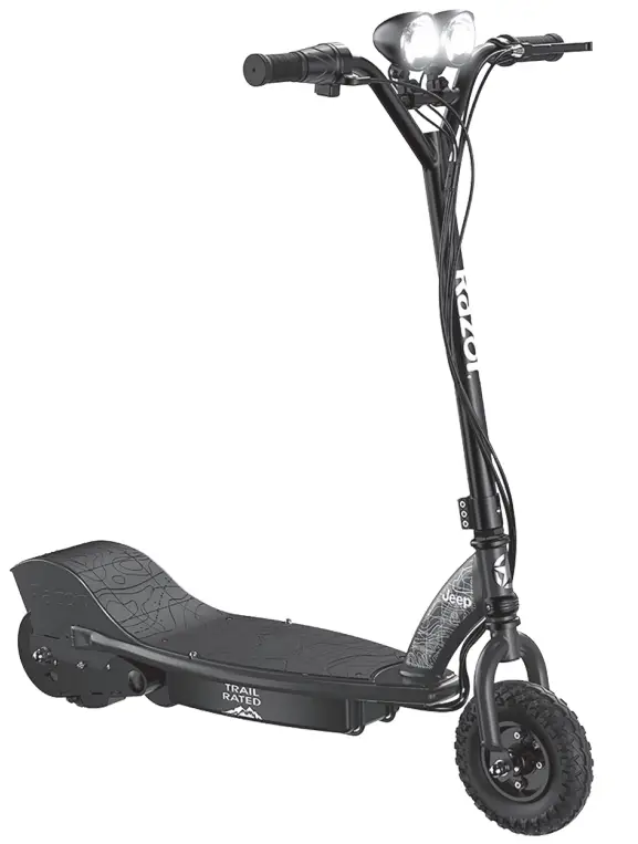 WARNING: Jeep RX200 ELECTRIC OFF-ROAD SCOOTER IS DIFFERENT IN MANY WAYS. This off-road electric scooter has inflatable tires, not solid tires like more basic electric scooters might have. Jumping and hard riding place greater stresses on tires, wheels, and components. Riders who may intend to use this electric scooter to ride “off-road” must be talented and experienced electric scooter riders able to handle the higher levels of risk and the higher degrees of expertise associated with such riding.