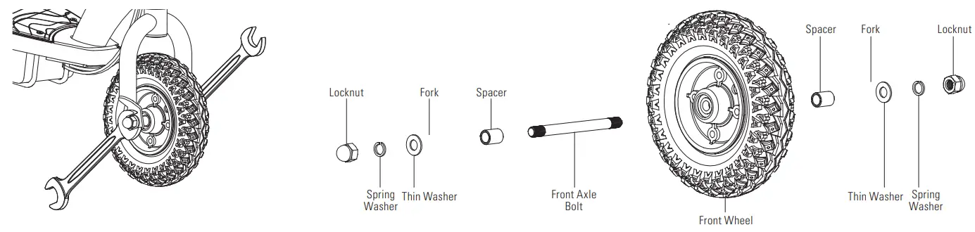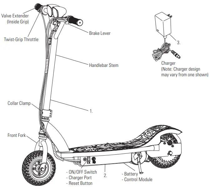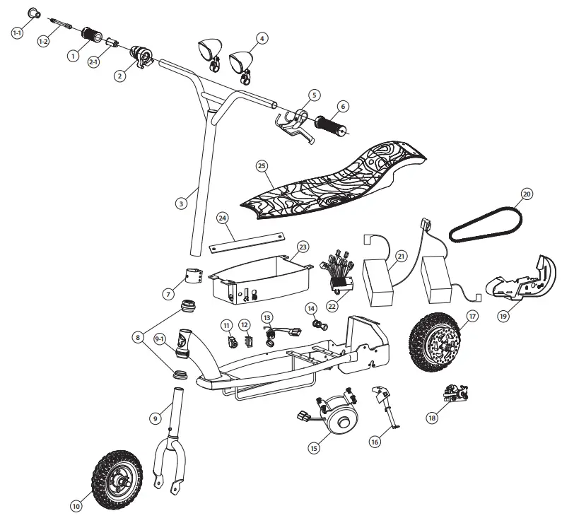 | 1. Handlebar Grip (Right) 1-1 Handlebar End Cap 1-2 Valve Extender 2. Variable Speed Twist-Grip Throttle 2-1 Sleeve 3. Handlebar Stem 4. Headlight Assembly (x2) 5. Brake Lever Assembly 6. Handlebar Grip (Left) 7. Collar Clamp 8. Headset (Upper/Lower) | 9. Front Fork 9-1 Limiter and Cover 10. Front Wheel Complete (See page 7 for hardware sequence) 11. Reset Button 12. On/Off Switch 13. Charger Port 14. Chain Tensioner 15. Motor (24V/200W) 16. Kickstand | 17. Rear Wheel Complete (See page 8 for hardware sequence) 18. Disc Brake 19. Chain Guard 20. Chain 21. Battery (2x 12V/7Ah) 22. Control Module 23. Battery Tray 24. Battery Bracket 25. Deck Plate |