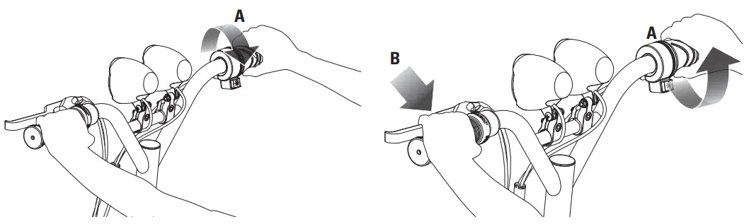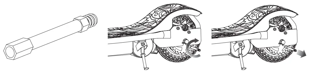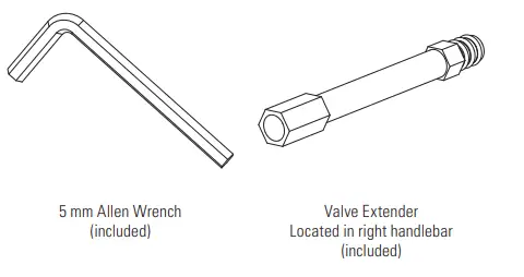 | 1 Use the included valve extender located in the end of the right handlebar grip. | 2 Thread the valve extender completely onto the valve stem and attach the pump. Inflate to the PSI indicated on the tire sidewall. | 3 Remove valve extender immediately after inflating. Return valve extender to right handlebar grip for future use. |