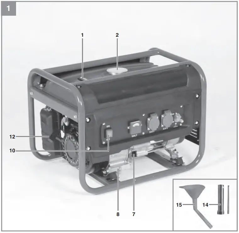 The device is designed for applications operated with a 230 V alternating current source. Be sure to observe the restrictions in the safety instructions. The generator is intended to provide electric tools and light sources with electricity. When using the device with household appliances, please check their suitability in accordance with the relevant manufacturer’s instructions. In case of doubt, ask an authorized dealer of the respective appliance.
