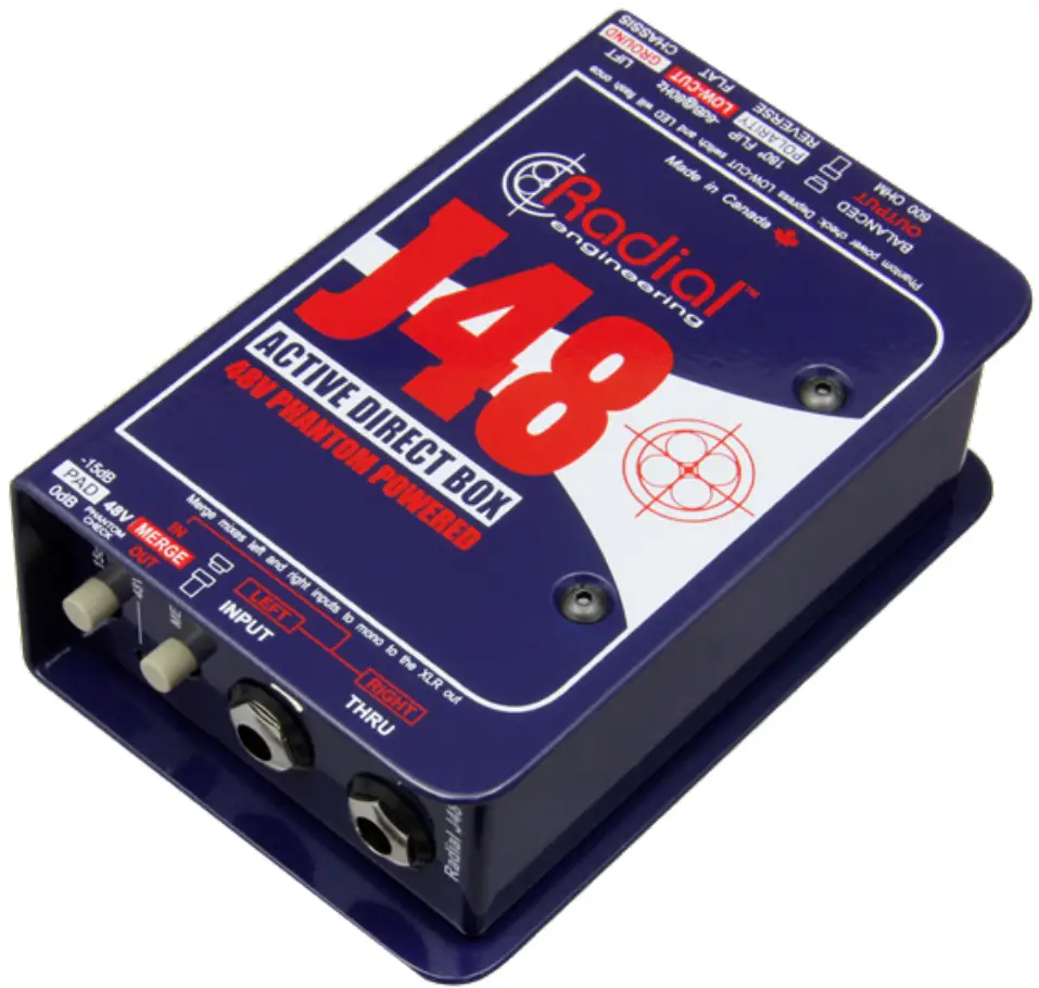 The Radial J48 is an active direct box. This means that it employs a powered circuit called a buffer to convert the impedance and balance the signal. The J48 derives its power from the mixing console using remote phantom power. Phantom power is a clever 48V-DC supply that comes from the mixer and runs on top of the audio through the XLR mic cable without affecting the audio. It was originally designed to provide power to capacitive or condenser microphones.