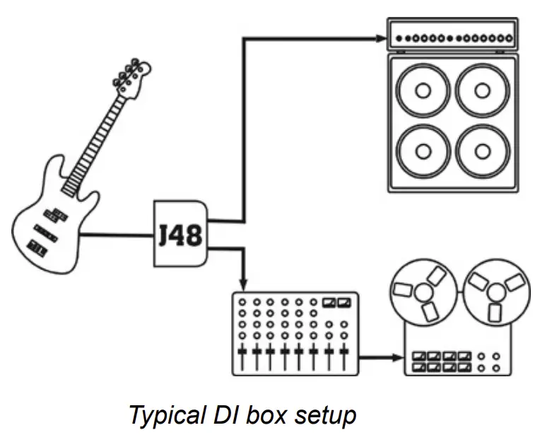 It should be noted that when you are `going direct’ or connecting a bass or acoustic guitar to the Radial J48 without using the thru-put, the ground switch should be set in the out position (grounded). If you are using the thru-put to your personal amp, then your amp and the mixer will have ground paths and breaking the ground would then be considered.