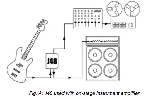 The J48 features a mic level, balanced output jack that uses a standard XLR male connector. This jack is wired to the AES (Audio Engineering Society) standard with pin-1 ground, pin-2 hot and pin-3 cold. Today, pretty much all equipment is manufactured using this standard. Connection is made to the mic-level input of the mixing console or to a standard mic preamplifier. The J48 is ideally suited for interface with concert snake systems and splitters where mic and direct box signals are directed to several destinations at the same time such as recording, monitor, broadcast and front-of-house mix positions.