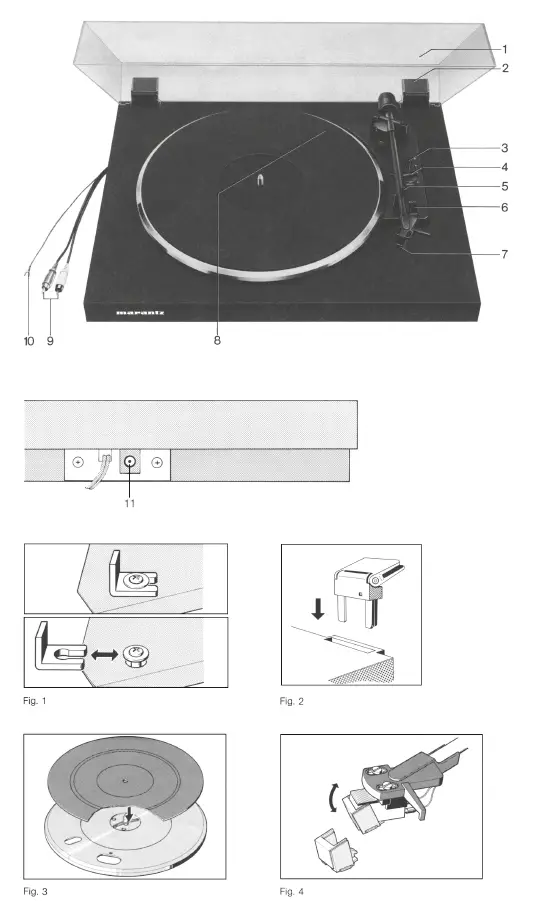 Fit the platter and depress the locking mechanism in its center until it engages in the groove of the platter spindle (fig. 2). Place the platter mat in position.