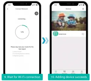 A1: ①.Device works with 2.4GHz Wi-Fi only, but not support 5GHz Wi-Fi. ②.Wi-Fi network is not good, try to keep the camera near the Wi-Fi router when setting up. ③.The Wi-Fi password is wrong. Please check if there are special characters in the password, or the network is specially encrypted.