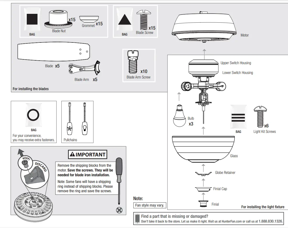 Please do not ship your fan or any fan parts to Hunter. Delivery will be refused.