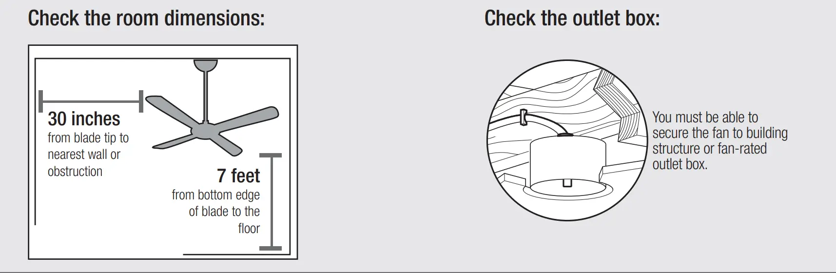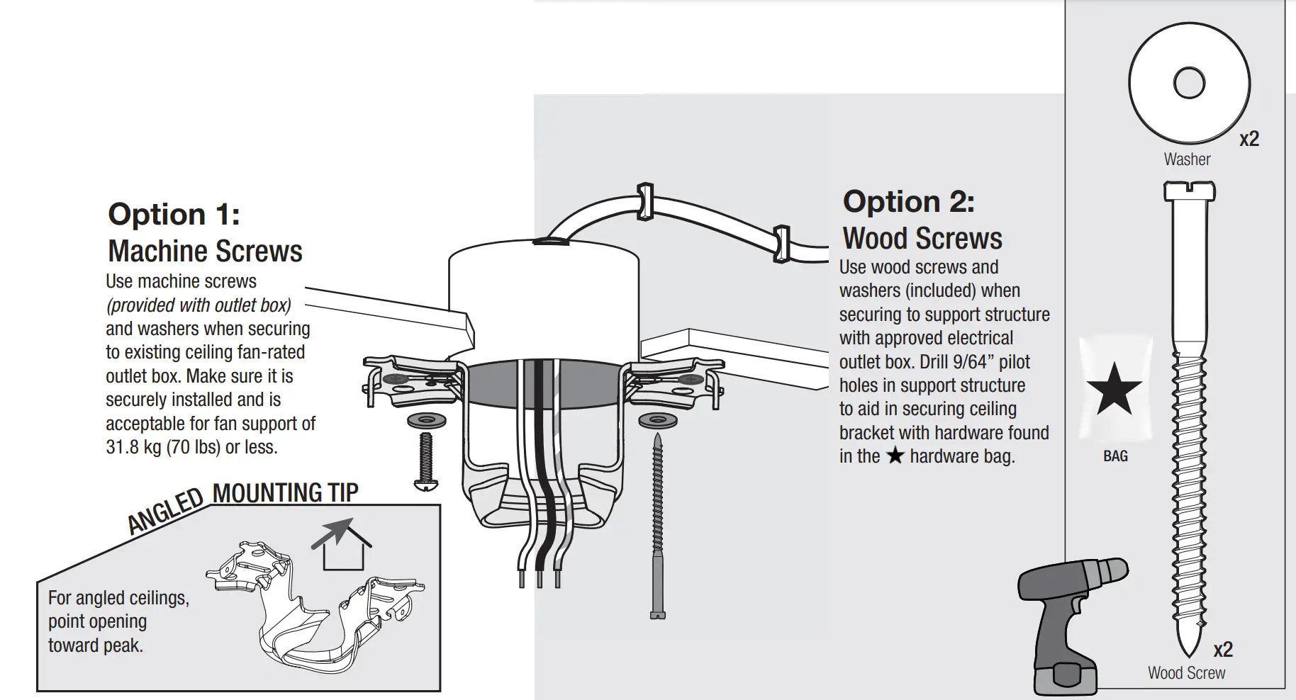 w.1 – To reduce the risk of fire, electrical shock, or personal injury, mount fan directly from building structure and/or an outlet box marked acceptable for fan support of 70 lbs (31.8 kg) and use the mounting screws provided with the outlet box.