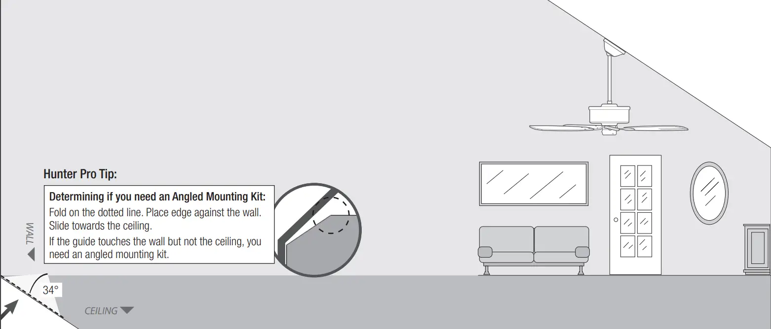 If your ceiling angle is greater than 34°, you will also need an Angled Mounting Kit. (Sold separately at HunterFan.com)
