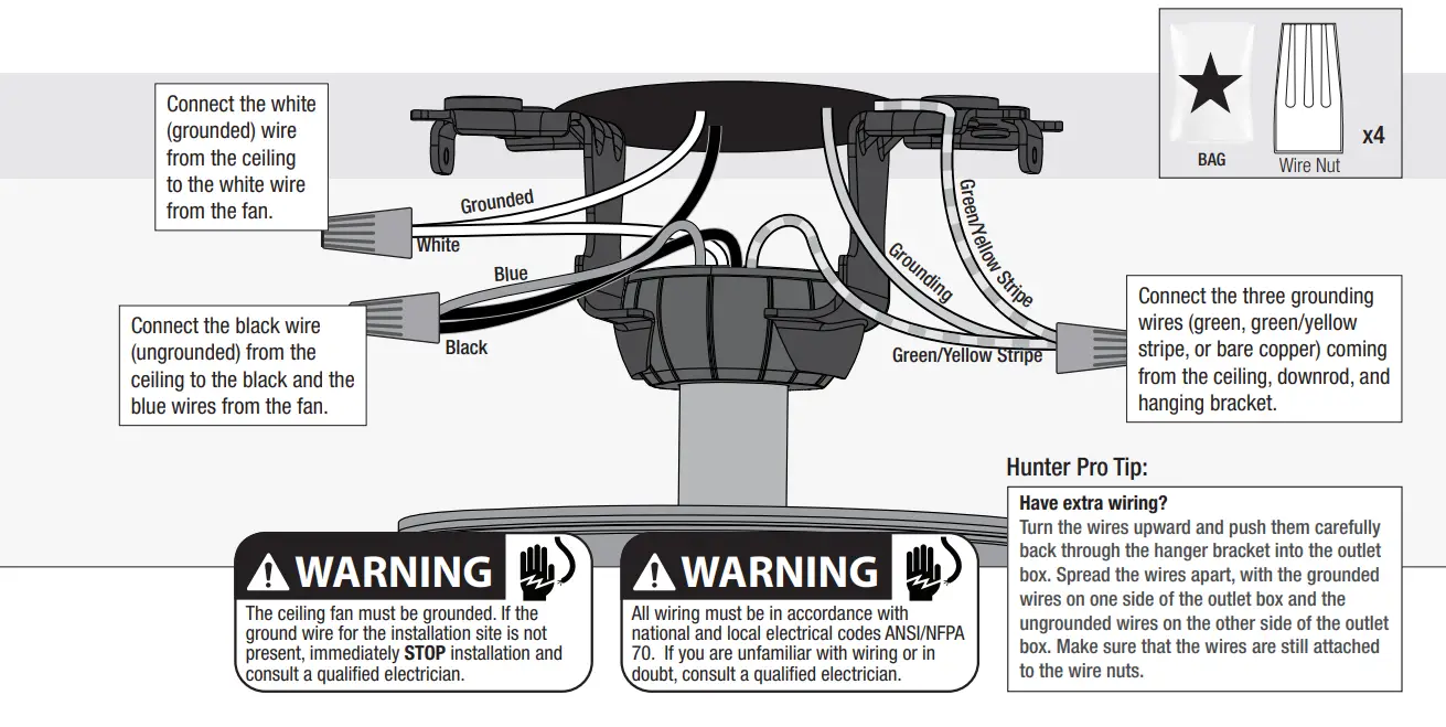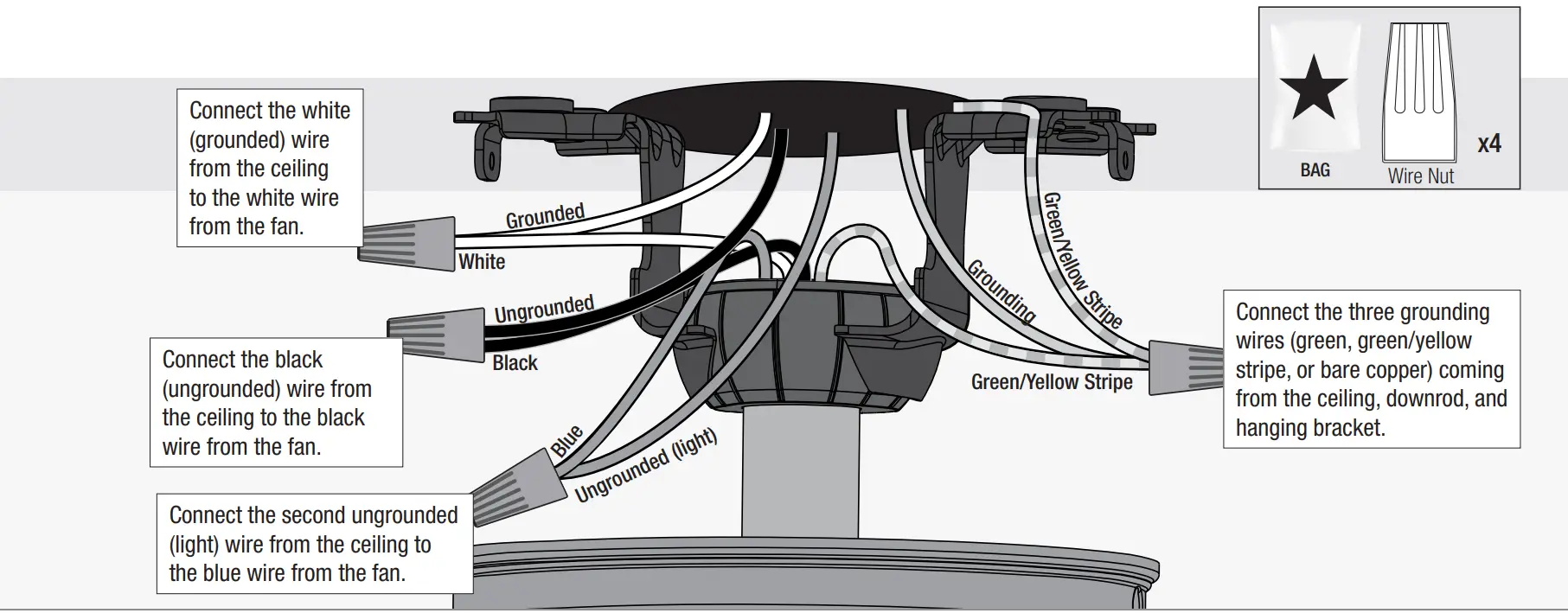 Follow these steps to get your fan wired quickly and safely. Follow the route below that best matches your wall switch setup. If you are unfamiliar with wiring or uncomfortable doing it yourself, please contact a qualified electrician.