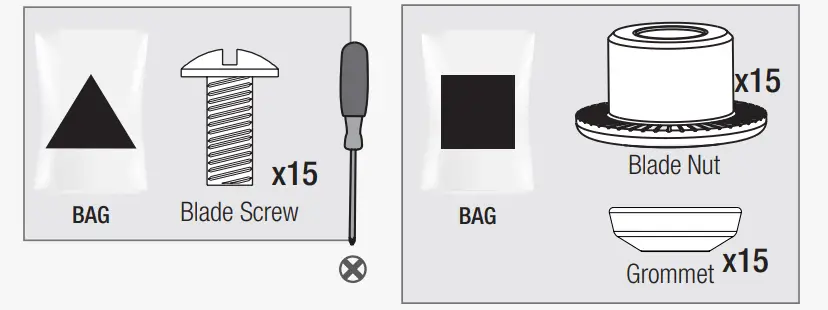 Secure each blade to a blade iron as shown using the blade nuts and grommets, found in the