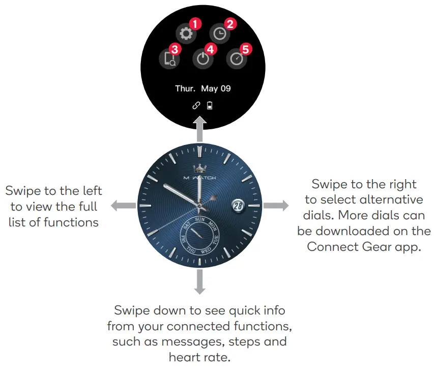 More dials can be accessed via the Connect Gear app, selecting Personalise Dials in the Navigation sidebar. Select a dial and it will transfer to your watch. When the transfer is complete, your watch will update and it will be selectable in the same method described above. The new face will have replaced the final dial from the default set; there will always be a total of 5 options to select from.