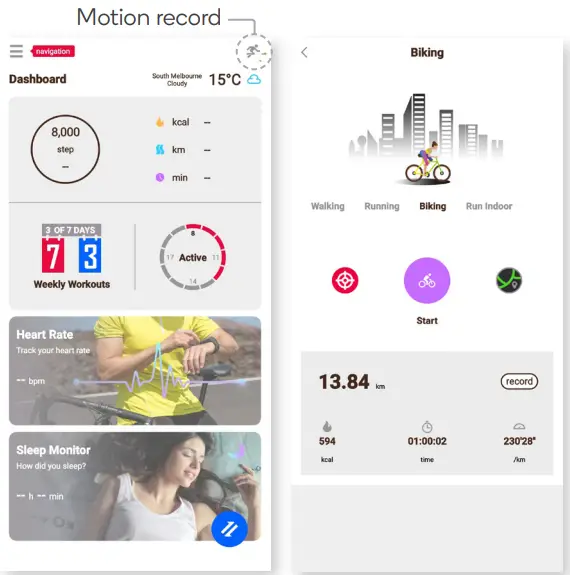 From the Connect Gear app’s homepage, open the Motion record page. From here you will be able to review previous data (from both phone and watch) and start a new session by pressing ‘Start’