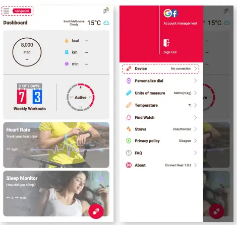- Unpair device: Within the Connect Gear app, select Navigation > Device > Unpair.