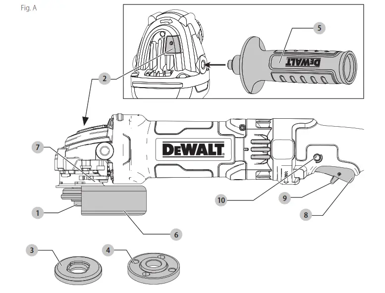 Spindle lock 2 is provided to prevent the spindle from rotating when installing or removing wheels. Operate the spindle lock only when the tool is turned off, unplugged from the power supply, and has come to a complete stop. NOTICE: To reduce the risk of damage to the tool, do not engage the spindle lock while the tool is operating. Damage to the tool will result and the attached accessory may spin-off possibly resulting in injury.To engage the lock, depress the spindle lock button and rotate the spindle until you are unable to rotate the spindle further.