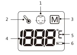 | Beep alarm | One short beep when power on and start measurement One long beep when measurement reading is below 37.5°C/99.5°F. 10 short beeps when measurement reading is greater than or equal to 37.5°C/99.5°F 3 short beeps when the system fails |