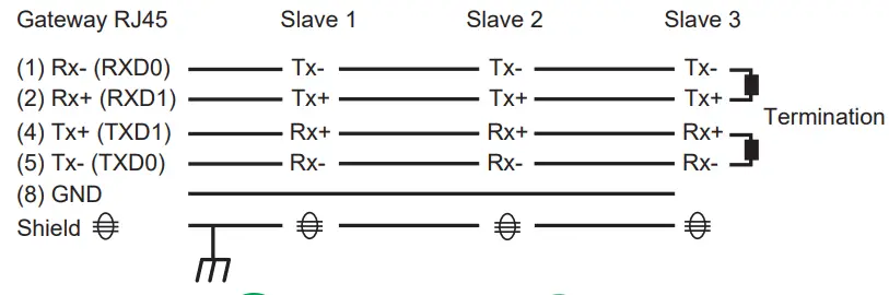 NOTE: – The color code for Belden 8723 is Green (Tx+), White (Tx-), Red (Rx+), and Black (Rx-).