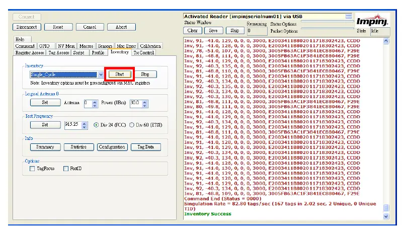 - Open the IndyTool. Click Start to scan RFID tags by using the RM100 UHF RFID Reader module.