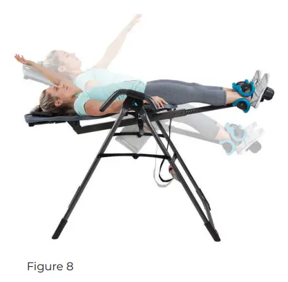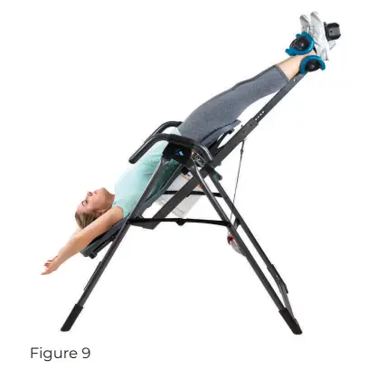 With your head resting against the backrest, slowly raise one arm over your head (Figure 8). Then, slowly raise your second arm until you have reached your preset inversion angle (Figure 9).