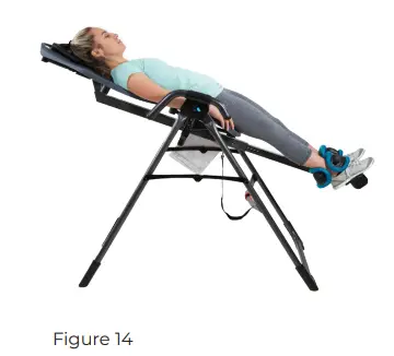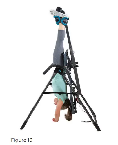 You never need to go into full inversion to get all the benefits, but once you are comfortable at 60 degrees, you may wish to try full inversion for a deeper stretch or inverted exercise. Disconnect the Angle Tether and rotate into inversion. If you are not fully upside-down, use your hand to push on the A-frame and continue your rotation backwards until the backrest stops against the Crossbar (Figure 10). With the correct balance setting, the backrest will remain securely “locked” in this position until you are ready to return upright. Relax and allow your body to release from the backrest so that you are freely hanging.