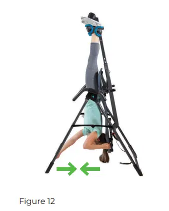 To release from full inversion, reach behind you and grasp the very top of the backrest with one hand. With the other hand, grasp the center of the A-frame in front of you. Pull your hands towards each other until you have released the locked position (Figure 12).