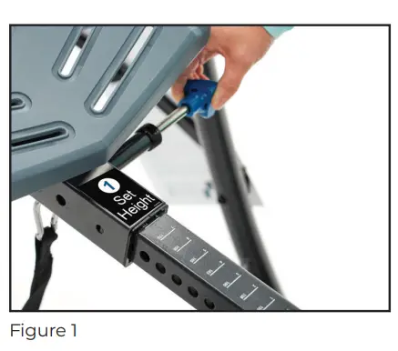 Setting to your proper height controls the speed and ease of rotation into and out of inversion. Stand on the same side as the Height-Selector Locking Pin. Lift the Main Shaft so it is parallel with the floor and pull the pin out (Figure 1). Slide the Main Shaft to your target height, making sure your height can be read. Release the pin so that it fully engages in the hole.