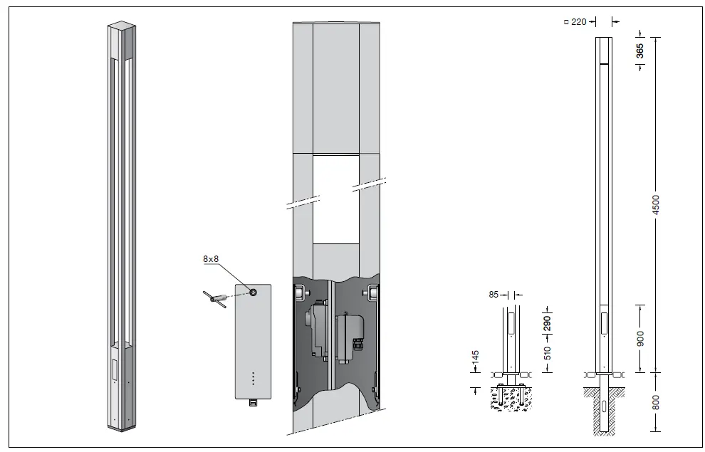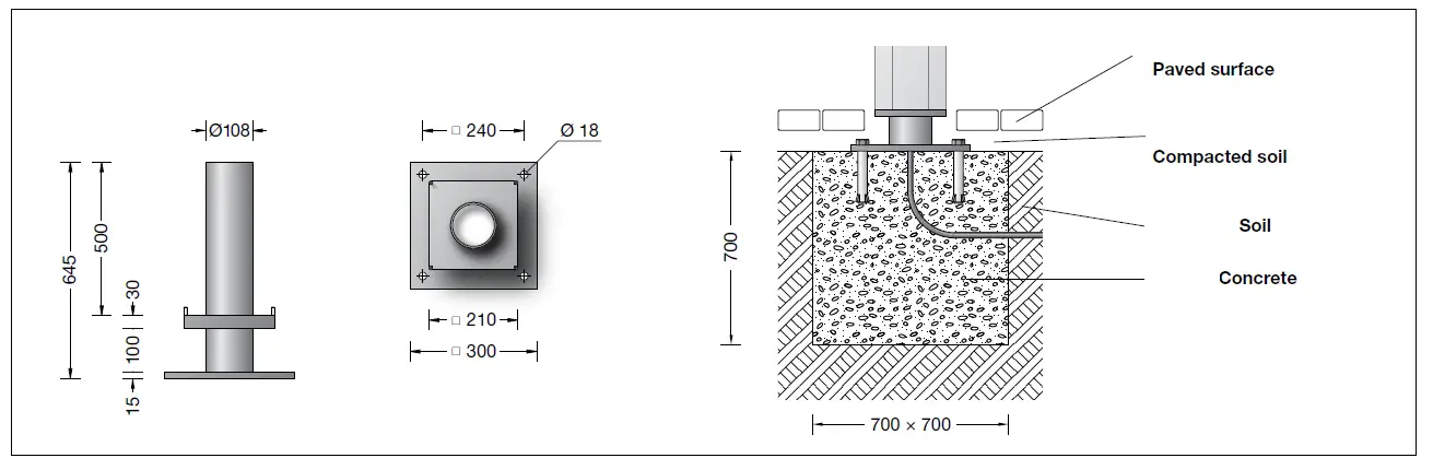 The fixing of the light building element can be done with anchorage unit 71 137 or screw-on base 70 829 for bolting onto a foundation