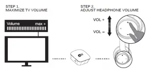 With some TVs and connection options, TV volume may be further raised or lowered to change the volume of all headphones paired with the Connect. In this case, volume should be maximized on the TV and then adjusted via headphones for best audio quality.