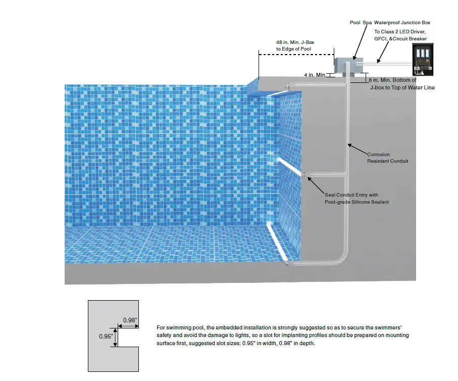 In accordance with the requirements of NEC680 regulation in the United States, when an illumination light is installed in the swimming pool, the distance from the bottom of the terminal box to the ground shall be no less than 4 inches. The vertical distance to the water surface of the swimming shall not be less than 8 inches, and the horizontal distance to the water edge of the swimming pool shall not be less than 48 inches.