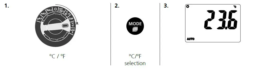 | Resistance, capacitance, diode check, continuity, temperature | 600V AC RMS or 600V DC | |
