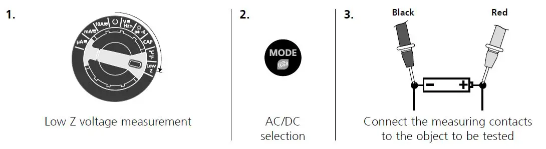 - Before taking any measurements, make sure that both the area to be tested (e.g. a line), the test device and the accessories used (e.g. connection cable) are in proper working order. Test the device by connecting it to known voltage sources (e.g. a 230 V socket in the case of AC testing or a car battery in the case of DC testing).