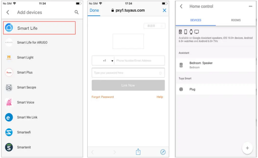 Google 10② YFind “Tuya Smart” in the list. In the new window, select your Tuya Smart account’s region, type your Tuya Smart account and password, then tap “Link Now”. After you assign rooms for devices, your devices will be listed on the Home Control page.