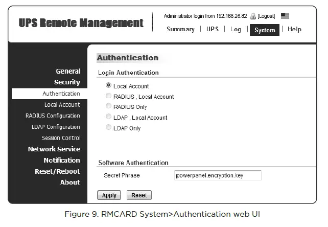 The remote management card requires authenticating with PowerPanel® Business Remote via a shared secret phrase, as shown in Figure 9.