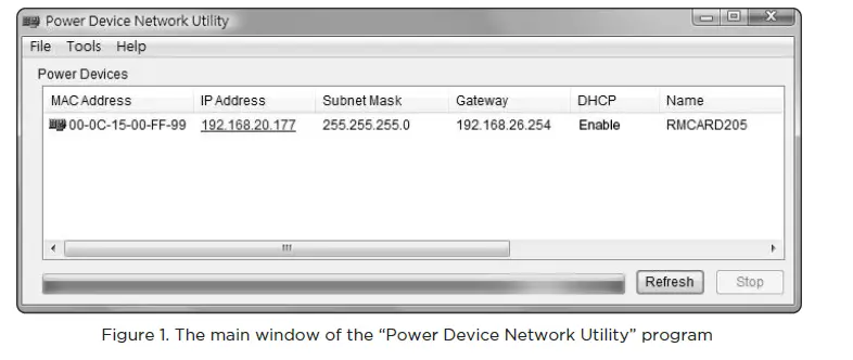 - The main window of the Power Device Network Utility program is shown in Figure 1. The configuration tool will display all CyberPower Remote Management devices present on the local network subnet. The “Refresh” button is used to search the local network subnet again.