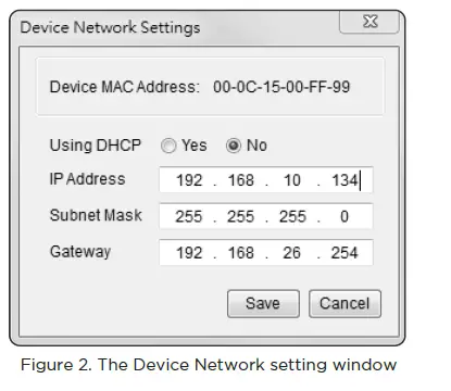 - You can modify the IP Address, Subnet Mask, and gateway address for the Device MAC Address listed in the Device Network Settings window, as shown in Figure