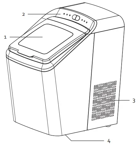 | 1. Transparent lid 2. Control panel 3. Ventilation opening 4. Drain hole with plug 5. Ice basket 6. Water tank | 7. Full basket sensor 8. Ice shovel 9. Water tray 10. Freeze fingers 11. Ice scoop |