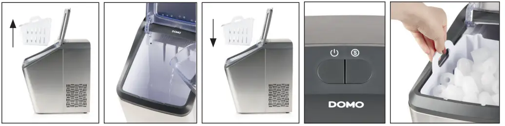 - Open the lid and take out the ice basket so you can pour water into the water tank. It is recommended to use spring water or mineral water. Do not use hot water, the recommended water temperature is between 8 and 25°C.
