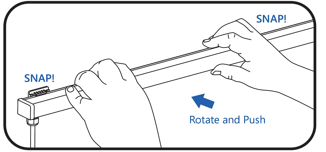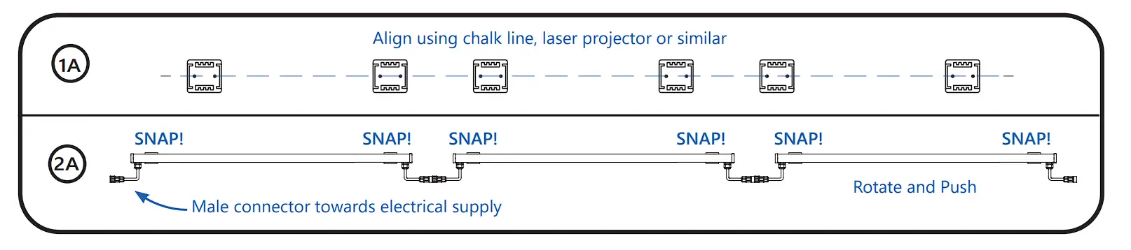 ② Press the luminaire into its mounting clips so that the male connector is oriented towards the intendedelectrical supply. TIP: Align luminaire on one side of the mounting clips, then rotate the luminaire until it snaps into other side of the mounting clips.