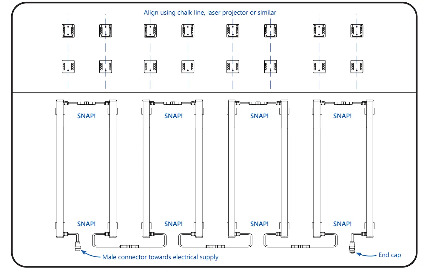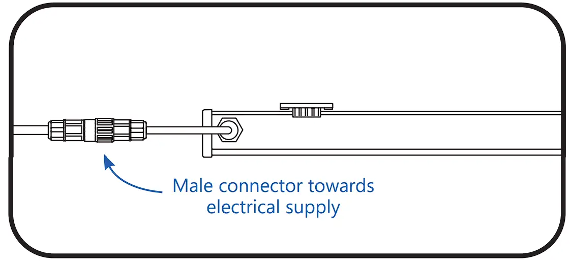 ① Insert the female connector of the leader cable so that it fully engagesthe male connector of the first luminaire in the run as indicated by hearing a click.