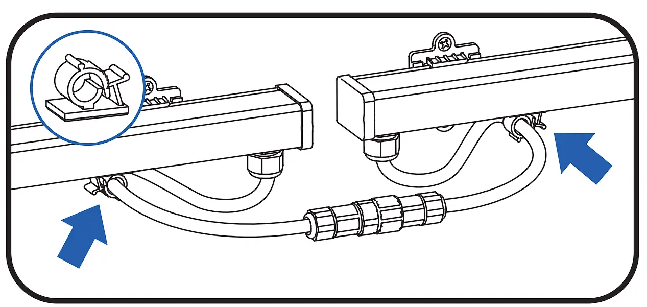 Please contact support at arize.[email protected] with regard to applications other than horizontal. In these applications, luminaires should not be directly interconnected and the male connector (power input) should be in the upward orientation with the female end facing down.