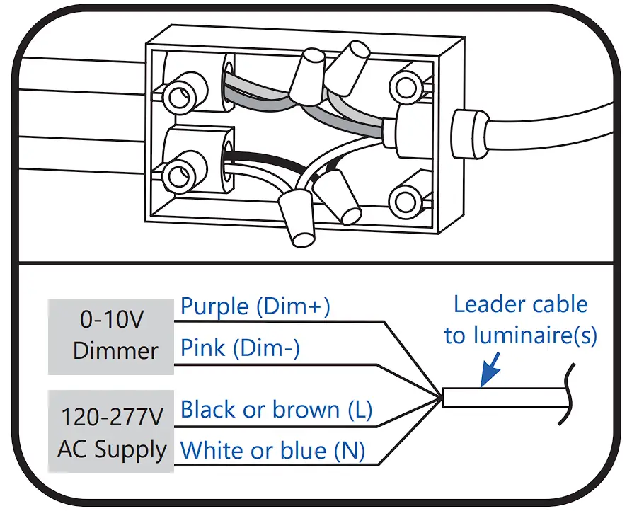 ③ Inside the junction box, connect the line and neutral wires of the AC supply source to the line (black or brown) and neutral (white or blue) wires of the leader cable using suitable wire nuts. If 0-10V dimming will not be used, cap the dimming wires (purple and pink*) with suitable wire nuts. Do not connect the dimming wires together or to line, neutral, or ground. If 0-10V dimming will be used, proceed to Step 4.
