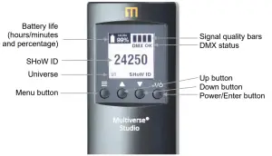 Upon power up, the Multiverse Studio Receiver displays the SHoW ID, universe, radio signal quality, and DMX connection status. Pressing the “Up” or “Down” button will take you to the universe selection screen. Pressing “Enter” will select SHoW ID or universe for editing and will commit the change when done.