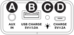 D. Micro-USB Speaker Charging Port: For fastest charging, power off Acadia™ and use the included micro-USB cable to connect the speaker to (A) a USB power adapter (DC 5V, included) connected to a power outlet, or (B) your computer (powered on). A solid red LED will appear next to the power button to indicate that the speaker is charging. When charging is complete, the red LED will turn off.