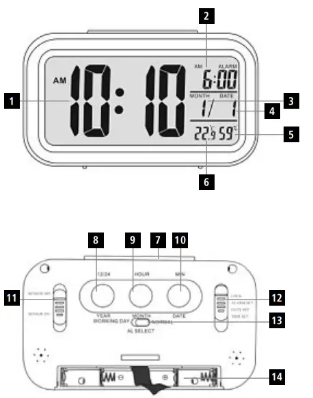 - HOUR/MONTH button =activate/deactivate the alarm / Display the set alarm time /set the hour/month