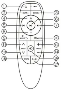 : Press the button to turn the soundbar on or to put it into standby mode.- SURR-: Press the button to decrease the volume level of the surround speakers.