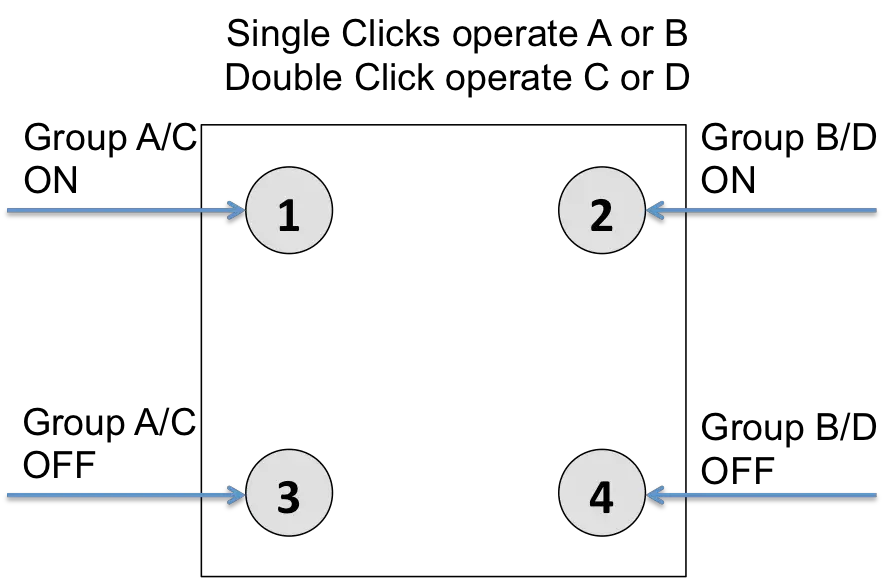 4 Groups are controlled with single button (parameter 1/2 = 0) The four buttons 1-4 control one single control group each: 1->A, 2->B, 3->C, 4->D. Single click turns devices in the control group on, double click turns them off. Click and hold can be used for dimming.