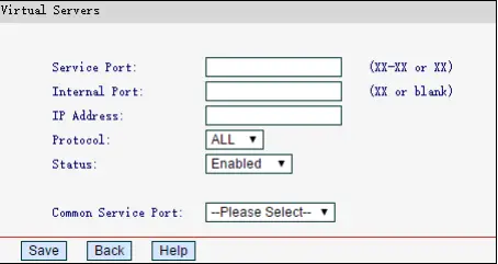 Type the Service Port which you want to open and the IP Address of your device that you want to open the port for; select Protocol to TCP, UDP or ALL; change Status to Enabled; click Save to save the settings.