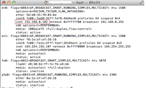 After we select Terminal, press Return key on your keyboard. Put ifconfig in the command window and press Return key again. Your IP address will be displayed next to the “inet” entry in et0 or Wi-Fi1.