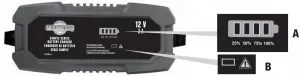 The battery charger has an easy-to-follow 4-LED charge status indicator: 25%, 50%, 75%,100%. This indicator provides an estimate of the battery’s state of charge as charging progresses. During charging, the corresponding state of charge LED will be flashing. When the 100% LED lights solid (i.e., stops flashing), the battery is fully charged and the charger has entered the Maintain stage (see Understanding the Multi-stage Charging Process).